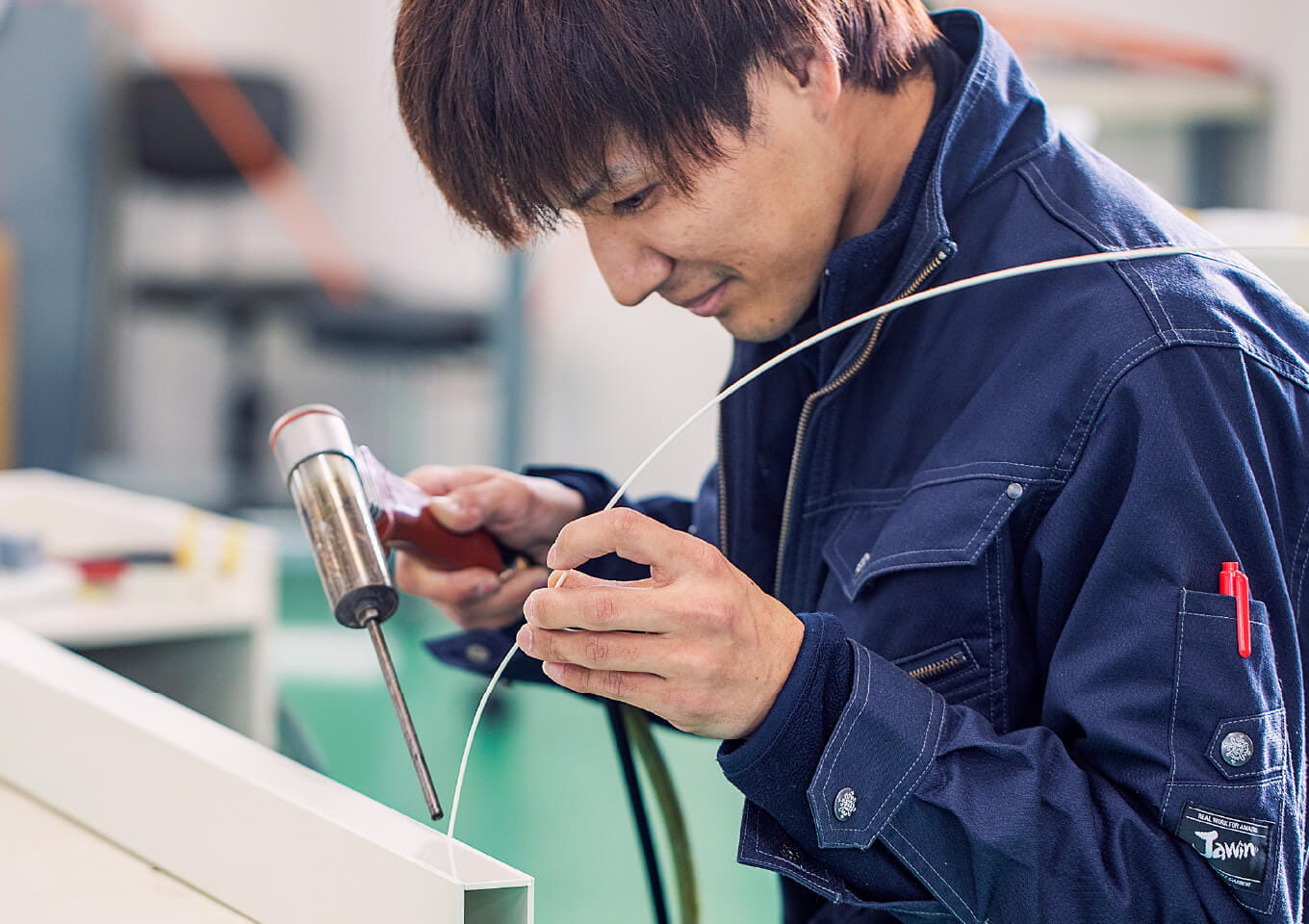 プラスチックの溶接棒を熱風で溶かしながら同質の部品を固定していく加工です。主にPVC(塩ビ)、PP(ポリプロビレン)、PTFE(テフロン)の材質を使用し溶接加工を行います。弊社が最も得意とする工程であり、長年の経験に基づく高度な溶接加工を実現しています。